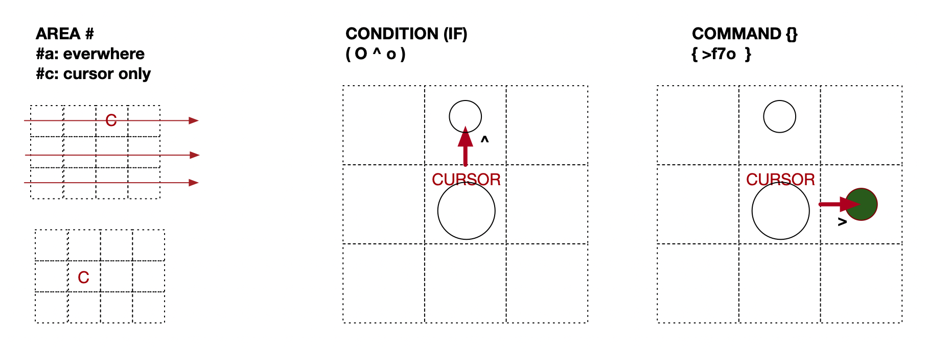 You can check all settings and also the actual position of the cursor (x,y). Example: #a([x<5][y<5]){ L }