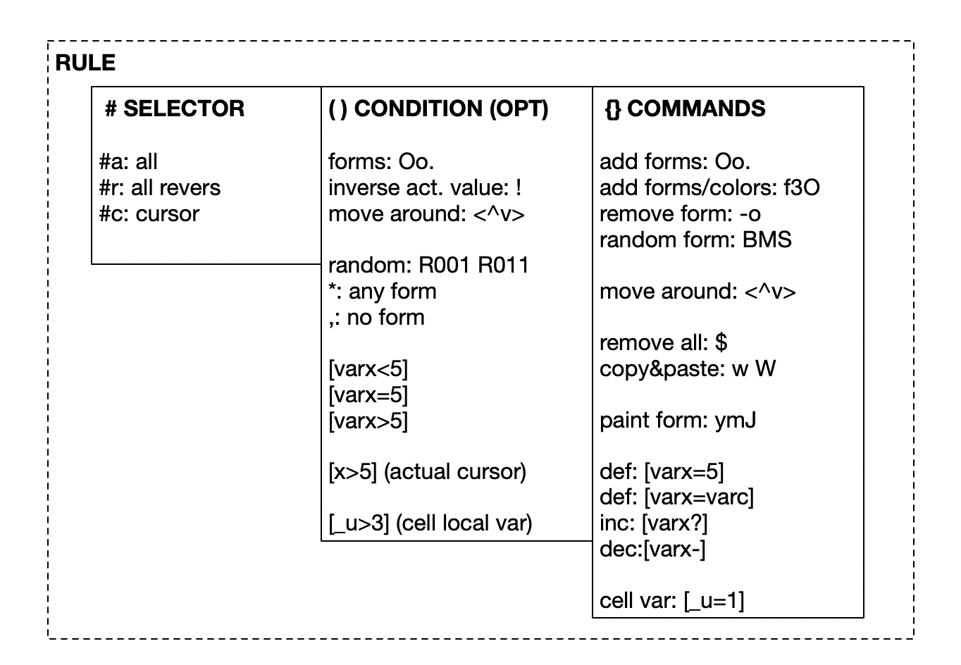 | SELECTOR # | CONDITION () | COMMANDS {} |